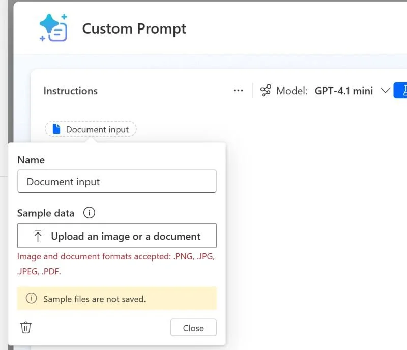 There are other options like Azure Document Intelligence or even micro-services you can set up as standalone Azure apps that can do this file ingestion and text or image output for you. However, a quick alternative that can get you to POC fast is just to use a Prompt with a cheap model like GPT-4.1-mini to do the content conversion from PDF to text for you. You're then free to use this output with any model you like.